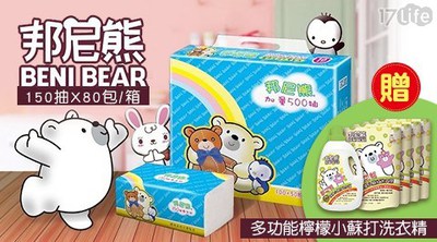 Benibear邦尼熊抽取式花紋衛生紙150抽x80包+邦尼熊洗衣精-5件組/組