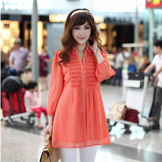 還是momo購物網比較便宜又不用人擠人上網選這組[注目推薦>【魅麗女人】胸前收皺亮采長版雪紡上衣(1349) ]