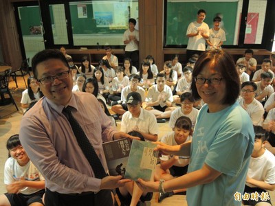 李三財(左)贈書鼓勵學生,由龍瑩瑩代表接受。(記者翁聿煌攝)
