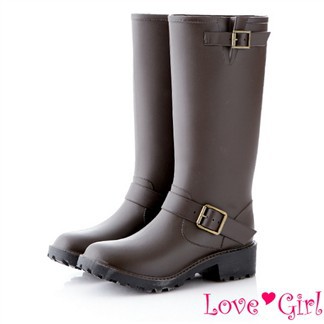 Love Girl 經典百搭帥氣雙扣環長筒雨靴-咖啡色
