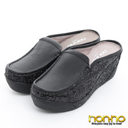 nonno 休閒樂活 亮片拼接包頭楔型厚底拖鞋-黑