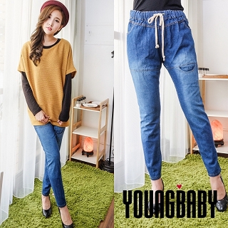 【YOUNGBABY中大碼】素面口袋鬆緊腰綁帶牛仔長褲(藍)