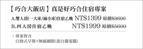 商品訊息簡述: 只要1399元起即可享【巧合大飯店】原價最高5600元真是好巧合住宿專案:(A)雙人房(一大床/兩小床)住宿乙晚/(B)奶H房住宿乙晚,專案皆含自助式早餐+無線網路(需自備電腦)。