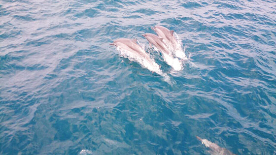 跟著賞鯨船可看到成群結伴的海豚互相嬉戲,一跳一躍劃出水面,激起美麗的浪花,讓人目不轉睛。