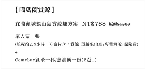 商品訊息簡述: 只要788元(單人價)即可享【噶瑪蘭號】原價1200元宜蘭頭城龜山島賞鯨趣:單人票乙張-賞鯨+環繞龜山島+專業解說乙次,航程約2.5hr+保險費+Comebuy飲料紅茶一杯/蔥油餅乙份(2選1)!