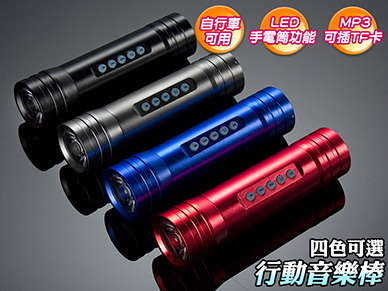 推薦瘋狂賣客-二合一炫彩行動音樂棒!低音炮MP3+LED手電筒,可用於自行車上,還可外插TF卡支援容量擴充!