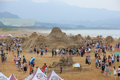 今天早上台北的天氣不錯,事實上是有點悶熱,不過還是想去外面走走,這是我第一次來到福隆海水浴場,不是來玩水,而是來看沙雕,這是從橋上鳥瞰整個會場。