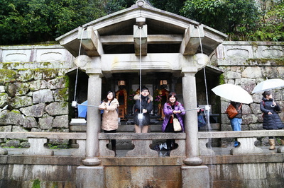 往下走就來到音羽之瀑。在清水寺得名的"音羽之瀑",自寺院始建以來,山中湧泉一如既往靜靜流淌,蒼翠的寺院境內,施有鮮豔色彩的15座寺堂和塔樓等掩映其中。