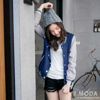 服裝推薦OB嚴選-0312新品 率性活躍~牛仔拼接條紋袖羅紋滾邊棒球外套