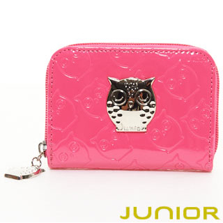 推薦momo熱銷商品【JUNIOR】低調奢華亮面皮質貓頭鷹烙印零錢包短夾(亮眼桃)