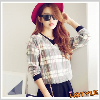 momo,momo購物台,momo購物網>【創翊韓都】T恤 歐根紗寬鬆格子長袖T恤JQ4017(現貨+預購)