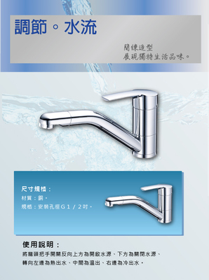 將龍頭把手開關反向上方為開啟水源、下方為關閉水源、轉向左邊為熱出水、中間為溫出、右邊為冷出水。