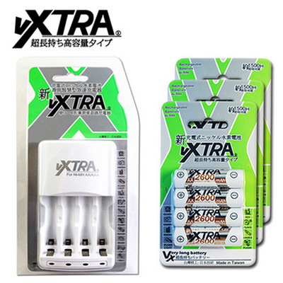 ?VXTRA ★低自放電鎳氫電池,為21世紀發明的新電池。電池內阻比舊式鎳氫電池低,因此放電時輸出電壓更穩定、充放電時產生的熱量也減少,用電效率更高,而且瞬間輸出電流也較大。使用新的物料作為陽極與陰極之間的分隔層,減少自放電現象。新的更薄但更堅固的外殼,以增加內部空間,內部空間的增加不但增加容量,也使內部化學物質的分佈更均勻,使得充放電次數更加提高。?