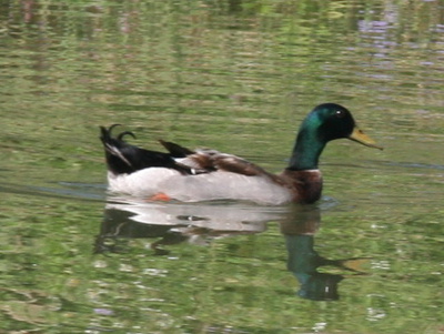 綠頭鴨 (雁鴨科/冬候鳥)學名:Anas platyrhynchos。英文名:Mallard。特徵:體長50-65公分,雄鳥的頭為金屬光澤的綠色,嘴為黃綠色,腳為橙紅色,頸部有白色頸環,尾部上覆羽向上...