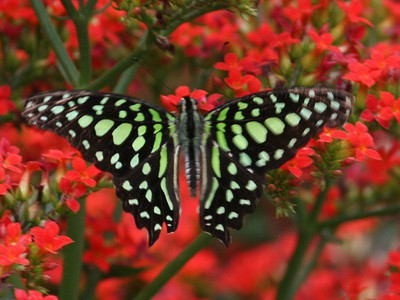 綠斑鳳蝶(學名:Graphium agamemnon) : 科名:鳳蝶科。 特徵:翅膀表面黑色,上面布滿草綠色斑紋,翅膀腹面呈淡紫紅色光澤,散生綠色的斑紋。 習性:本種分布於平地至低海拔山區,以...