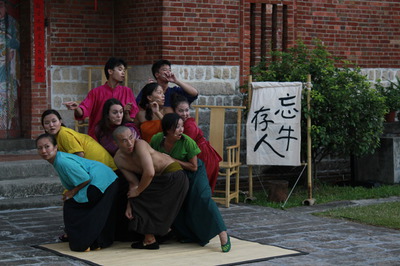 《十牛圖》第一部分(大宅門外的演出)處理禪與台灣歷史的問題更是多番著墨。誠然,演出在佛理層面是淺入淺出,又當中雜亂地穿插事件︰台灣原住民問題、蘆洲李宅之主李友邦等故事,枝節叢生,令對「禪」有一定見解,或大體上以簡約/淨空為主流意見的宗教人士感到格格不入;另一邊廂,對非宗教人士,一些想看劇場的人而言,在演出中加插教化、說理,又似乎減卻了看「劇場」的吸引力。以致,不論有佛教背景的觀眾,還是想看環境劇場的,同樣在第一部分找不到可切入的觀賞角度,得不到滿足。然而,如果跳出「場」的框架之外,我會發現兩種觀眾的未融合,也許就是第一部分的主題,也就是第一圖到第七圖(尋牛、見跡、見牛、得牛、牧牛、騎牛歸家、忘牛存人),人為了滿足需要而尋找「人」與「牛」,然而所謂的需要,似乎未必是外求,而是觀點與角度上的修正,甚至進一步,是放下對外觀賞及內在觀照,回到「空」。