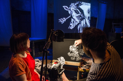 就是這樣,演出以大量準備好的畫片,利用以前後景緻,緩急交錯,光效及節奏輕快的音樂,做出各種驚險奇情,溫柔浪漫。墨水筆觸的圖畫不能說是仔細,但單線條的構圖很乾淨地表達豐富內容,絲線勾出精密的背景,皇宮、巴士上的眾生相,一抹墨水便是狼,畫風是既纖細又豪爽。而漫畫人物不是精緻或可愛,而在逗點眼睛上附帶憂鬱,確實有一份舊歷史書內神話人物的風貌。