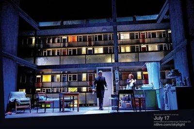 曾創作《此時此刻》(The Hours)及《讀愛》(TheReader)等,英國著名的影視及戲劇劇作家Sir David Hare撰寫的作品,總在仔細描繪親情、伴侶關係之間,流露出他對政治及人性的獨到見解,即使是電影商刻意把劇本浪漫化來增加消費效能,或者說Hare是那種高手,像《此時此刻》一樣,往往故意留下伏線,讓電影商大賣故事中的浪漫橋段,卻在文字中的情欲愛恨背後,對時代劃下一道沉重的筆觸,痛撃社會問題,尤其是歐美社會那種無形的階級觀念。致使,我被《Skylight》這個指涉多重文化符號的名字吸引。誠然它擁有中文譯名那種突出愛情的元素,但有趣的是Skylight一詞已指向了劇中的地理位置,一種香港或大城市常見的,在密集樓宇之間的那一線僅餘的天空。在英國倫敦,那是較貧窮的東區。然而最為重要的是,Skylight更在浪漫情節舖陳的最後發揮了諷刺的作用,一下子撕破了男女主角Tom及Kyra對浪漫的不同想像,包括了具體描寫男主角自以為skylight可讓妻子看到美麗的天,及象徵了女主角自以為躲在貧民區欣賞skylight便顯得清高,那是上流及偽中產的自我感覺良好。編劇就像利用我們看慣受落的話劇,那些不斷刻劃人性深刻面貌的劇本,讓我們內心總為角色情緒而翻湧、感動,但最後Hare卻要告訴我們,角色的感情甚至是觀眾看戲的感動,不過是一種沒有深刻思考的自我欺瞞,自憐自傷又為之快樂。