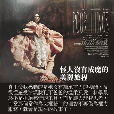 電影有些關於對人類的叩問會令我毛管戙的。Emma Stone呈現到Bella從對世界無知好奇到充滿睿智的過程,在一個對女性充滿敵意的世界,如何努力保持自我,而她的學習方式則沿習於「爸爸」的科學精神。而真正令我感動的,正是她並沒有繼承前人的殘酷,反很懂感受冷漠臉孔下爸爸的溫柔及愛。科學最終不是拒絕感情的工具,而是讓人理智思考,而當那個常作為父權藉口的理智不再僅為權力服務,就會是現在的故事了。這絕對是《科學怪人》的善意版,電影代Frankenstein向怪人說出了愛與抱歉,讓同是「創造物」的Bella不至走上妒忌與殺生之路。