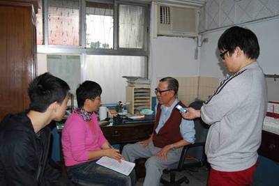 組員們和指導老師很認真的聽醫師回憶起,就讀熱帶醫學研究所的同窗,