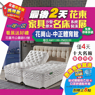 【花蓮訊】一年一次家具名床績優工廠進口商聯合廠拍、花東【國際-家具、名床、沙發、原木、系統裝璜-大展】於5月20日(五)至23日(一)於花崗山-中正體育館(免費停車)-聯合盛大展出、全面批發特惠再特惠、今年擴大展出特邀台北世貿特優名廠、進囗商及工廠聯合盛大展出,僅有四天。