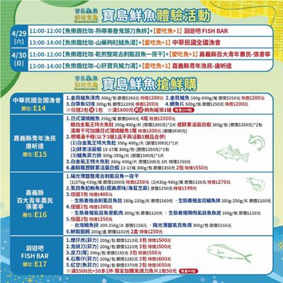 為便利民眾選購產地直送優質國產水產品,兩日在希望廣場展售攤位邀請包括全國漁會、嘉義縣青年漁民-唐昕遠、百大青農-張書寧(Fun心鮮蝦)、洄遊吧 FISH BAR等漁民團體,更推出不同限時限量搶好康購魚優惠。現場除展售已經幫消費者完成三清分切、真空包裝的金目鱸魚、臺灣鯛、白帶魚、鰻魚、白蝦、虱目魚、午仔魚等,以及來自太平洋野生鬼頭刀、雨傘旗魚、紅甘、點甘、甘仔魚、石喬仔等眾多生鮮水產品外,還有豐富多樣化的魚丸、魚罐頭等加工品供消費者選購;如當周不便前往的民眾,也歡迎利用全國漁會網路商城或至『寶島鱻魚』臉書粉絲團,隨時掌握最新活動訊息,跟著時令品嚐在地好魚。