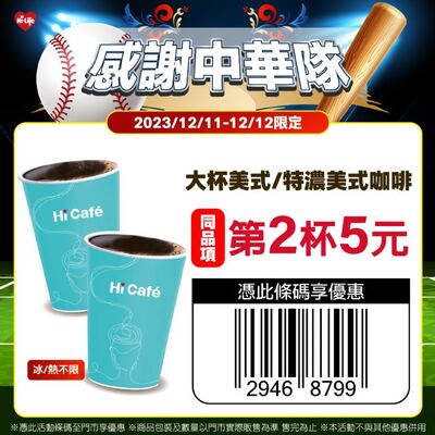【記者林子霞台北報導】為期八天的2023年第30屆亞洲棒球錦標賽,到此告一段落。雖然奪「冠」之路夢碎,終場中華隊以0:1落敗日本,銀恨收場,但中華隊在2023年第30屆亞洲棒球錦標賽的努力與精采表現,早已深植全台球迷心中。為感謝中華隊的拚戰精神,萊爾富祭出指定咖啡限定快閃優惠與民同歡,12/11至12/12兩天,民眾可憑活動條碼於門市購買Hi Café大杯的美式咖啡或特濃美式咖啡享同品項第2杯5元(不能寄杯但不限購),冰熱不限。