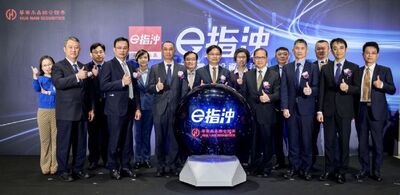 圖說:華南永昌證券董事長黃進明(中)、華南永昌證券總經理林長慶(右三)與公司長官們上市發表啓動儀式合影。