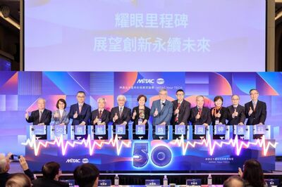 圖說:50週年慶祝活動由集團董事長苗豐強(右六)率領集團子公司董事長、總經理上台揭開活動序幕。