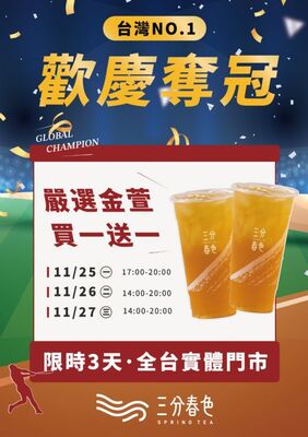 三分春色狂賀中華棒球隊超狂世界冠軍慶祝活動,三分春色全省門市同步自11月25日(一)- 11月27日(三),限時購買『嚴選金萱茶』買一送一。還不趕快衝波。