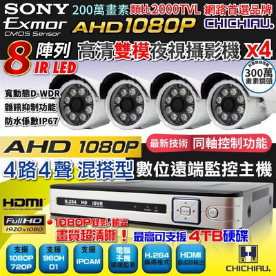 【夏季最新款】【CHICHIAU】4路AHD 1080P數位高清遠端監控套組(含雙模切換SONY 200萬畫素8陣列燈監視器攝影機x4)-推薦情人節禮物