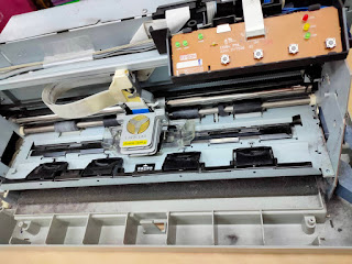 整台拆開做保養校正動作,發現內部還有貼紙與紙張,取下後重新校正撞針,列印後正常。
