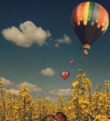 暖色系的畫面 意識被領著進入 無聲息的歡呼 在平地逐漸高漲 彩虹般的熱氣球啊 因此向上推去了 拉著串串紅心 往天空飛翔 亦或是 那初衷放逐的幸福 單純 想飛