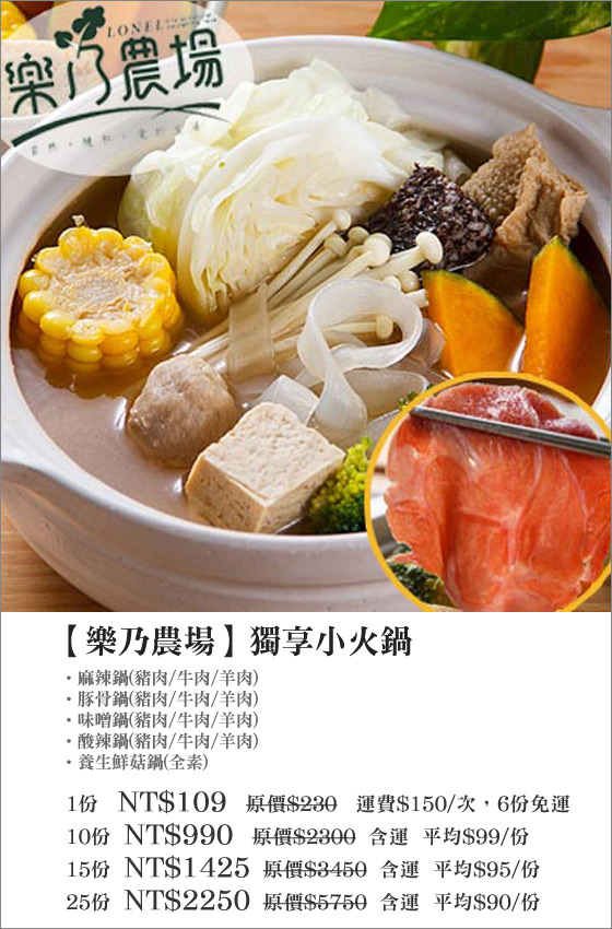 商品訊息簡述: 平均每份最低只要90元起即可購得【樂乃農場】獨享小火鍋1份/10份/15份/25份,口味:麻辣鍋(豬肉/牛肉/羊肉)/豚骨鍋(豬肉/牛肉/羊肉)/味噌鍋(豬肉/牛肉/羊肉)/酸辣鍋(豬肉/牛肉/羊肉)/養生鮮菇鍋(全素);購滿6份免運。