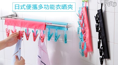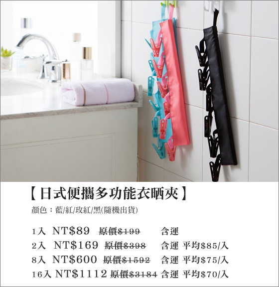 商品訊息簡述: 平均每入最低只要70元起(含運)即可購得日式便攜多功能衣晒夾1入/2入/8入/16入,顏色:藍/紅/玫紅/黑(隨機出貨)。