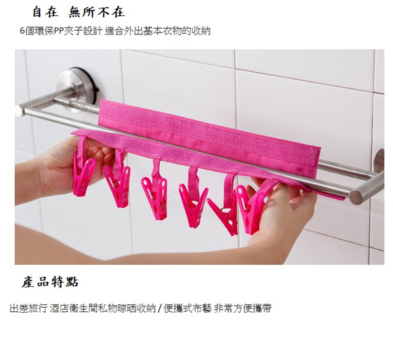 宅配旅行出差在外必備!方便攜帶不佔空間,六個環保PP夾可晾曬個人私物,襪子、內衣不用再溼答答的掛椅背啦! 的產品介紹在下面,