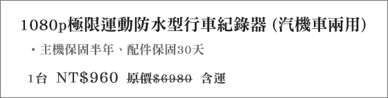 商品訊息簡述: 只要960元(含運)即可購得原價6980元1080p極限運動防水型行車紀錄器(汽機車兩用)1台,購買即享主機保固半年服務!