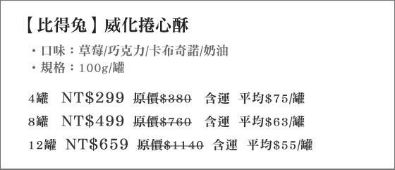 商品訊息簡述: 平均每罐最低只要55元起(含運)即可購得【比得兔】威化捲心酥4罐/8罐/12罐(100g/罐),口味:草莓/巧克力/卡布奇諾/奶油。