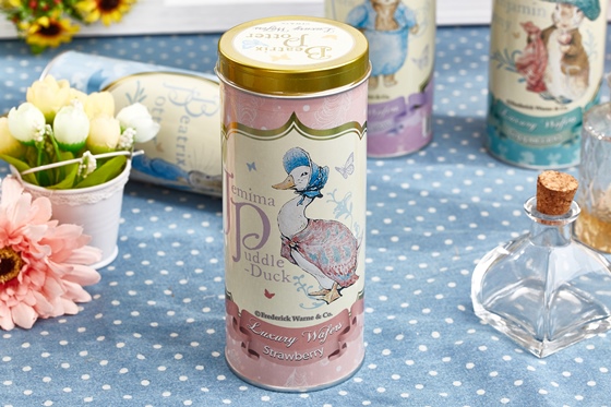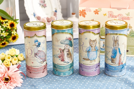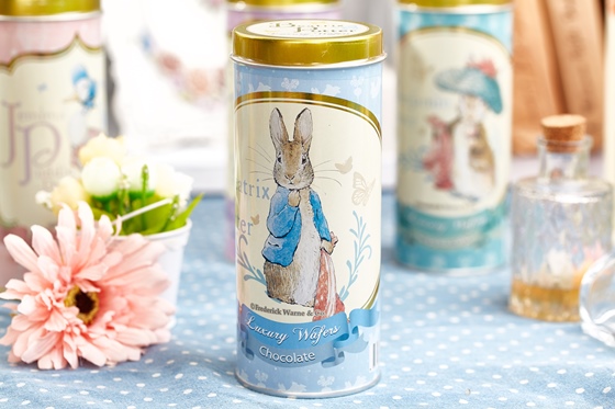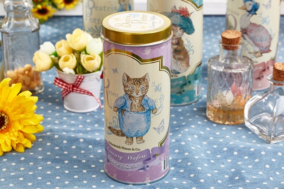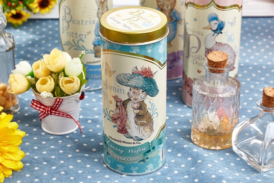 四種口味,各自有不同享受的口感。草莓酸甜、巧克力濃郁、卡布奇諾微微的甜苦、奶油的濃醇香氣,搭配酥脆的威化捲,一口咬下,濃郁的滋味立即在口中蔓延。外包裝是「比得兔」系列的插畫罐裝,從裡到外無一不是經典。