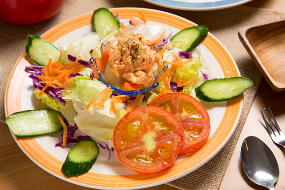 豐盛菜蔬與新鮮水果擺盤,淋上新鮮優格濃郁滑順,份量足夠、清爽宜人。