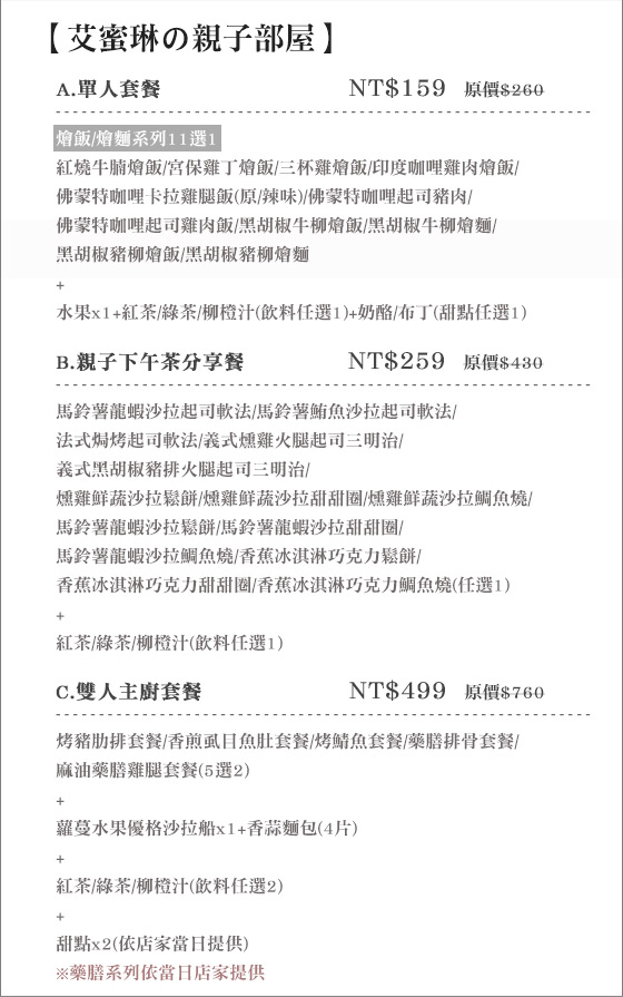 商品訊息簡述: 只要159元起即可享用【艾蜜琳?親子部屋】原價最高760元套餐方案:(A)單人套餐:燴飯/燴麵系列x1+水果x1+奶酪/布丁(甜點任選1)/(B)親子下午茶分享餐:馬鈴薯龍蝦沙拉起司軟法/義式燻雞火腿起司三明治/燻雞鮮蔬沙拉鯛魚燒/馬鈴薯龍蝦沙拉甜甜圈/香蕉冰淇淋巧克力鬆餅等(8選1)/(C)雙人主廚套餐:烤豬肋排套餐/香煎虱目魚肚套餐/烤鯖魚套餐/藥膳排骨套餐/麻油藥膳雞腿套餐(5選2)+蘿蔓水果優格沙拉船x1+香蒜麵包(4片)+甜點x2(依店家當日提供),餐點附含飲料。