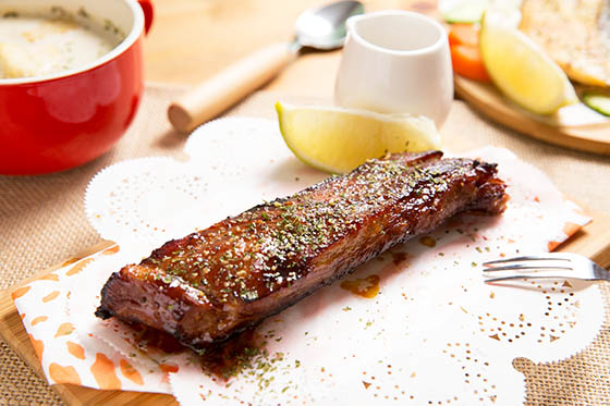 醃製過後的豬肋排,放上烤架上火烤香氣直竄,油脂與肉汁滴滴誘人,醬汁調味更是美味至極,撒上些許香料紮實完美。