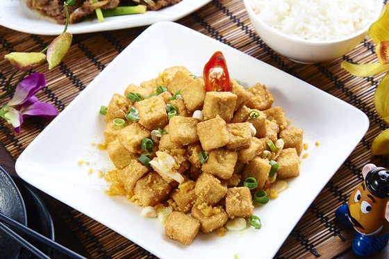 大火過油的鹹蛋,不斷冒出金黃如流沙的泡沫,再將炸過的豆腐下鍋,讓每一塊豆腐都伴著薄薄的金色表面,迷人的蛋香,吃過後沒有不迷戀的。