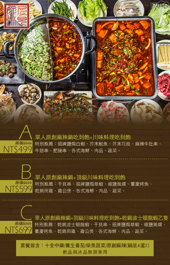 商品訊息簡述: 吃到飽!只要499元起即可享用【好久不見原創麻辣鍋】原價最高999元麻辣鍋吃到飽方案:(A)單人原創麻辣鍋+川味料理吃到飽/(B)單人原創麻辣鍋+頂級川味料理吃到飽/(C)單人原創麻辣鍋+頂級川味料理+乾鍋波士頓龍蝦乙隻。