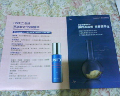 收到UNITEC彤妍燕窩素全效緊緻菁萃已經一陣子了~但是~一直忘了拿出來試用~直到最近在整理信件時候才發現到~呼~好險再晚個幾天就要被列為黑名單了~收到了5包各2ml的UNITEC彤妍燕窩素全效緊緻菁...