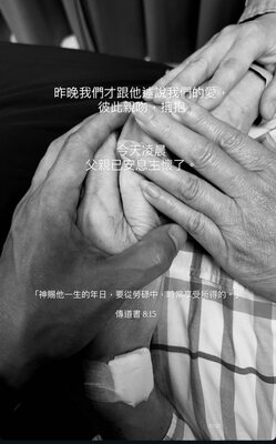 據「鏡週刊」報導,日前楊祐寧宣傳新片「泥娃娃」時透露爸爸還在住院,不過前幾日已傳出住進安寧病房,昨(11日)原定與張軒睿前往高雄做映後活動,但他臨時取消行程,未料隔天就傳出楊爸爸病逝消息。楊祐寧今po出病床旁緊握父親雙手的黑白照片,並寫下「昨晚我們才跟他述說我們的愛,彼此親吻,擁抱。今天凌晨,父親已安息主懷了。」在病榻旁與父親告別。