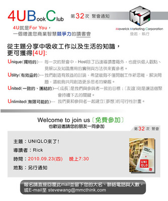 Dear All,9月23日(Thu.) 19:30【4UBC】將由Rick分享<UNIQLO來了>,精彩內容保密到家,歡迎今晚一起來窺視!4UBC_1009-2EDM(UNIQLO)