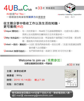 Dear All,10月14日(Thu.) 19:30【4UBC】將由Cabinet執行長Willy介紹詹偉雄先生著作<<美學的經濟>>《美學的經濟》這本小書,不是財經論文,而...