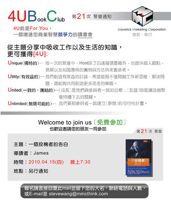 4月15日 19:30【4UBC】將由James與大家分享《一個投機者的告白》的讀後心得並且帶領參與者討論相關...