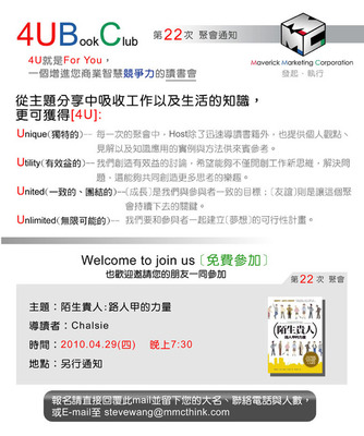 Dear all,4月29日的4UBC,將和大家討論「人脈」這個主題。歡迎大家一起來認識更多「陌生貴人」,讓您...